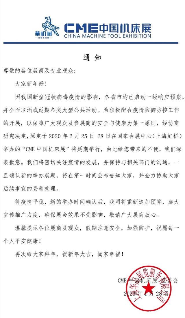延期通告:上海虹橋國家會展中心舉行的2020CME中國機(jī)床展延期舉行