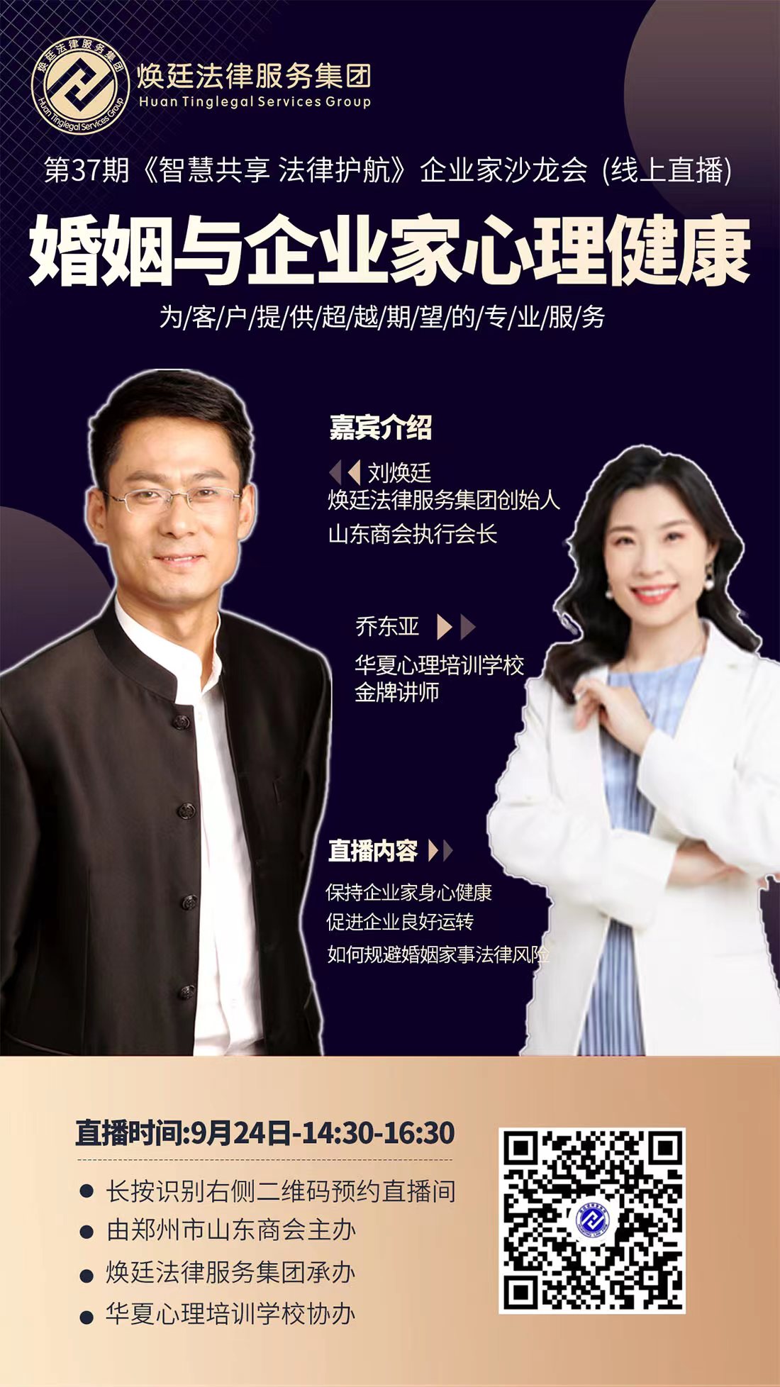 本期沙龍由鄭州市山東商會主辦,煥廷法律服務(wù)集團(tuán)承辦,本期將針對《婚姻與企業(yè)家心理健康》展開交流與分享,本期特邀煥廷法律服務(wù)集團(tuán)創(chuàng)始人劉煥廷主任為大家分享!