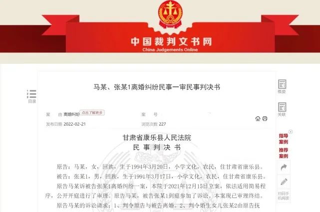 判決書(shū)顯示,馬女士與張先生經(jīng)人介紹,于2016年1月1日按照當(dāng)?shù)亓?xí)俗舉行婚禮,2016年2月5日在康樂(lè)縣民政局辦理結(jié)婚登記,婚后生下一子一女。2019年,女兒感染肺炎,馬女士帶女兒去看病,向自己父親借款5000元用于孩子治療。在馬女士看來(lái),丈夫及其家人對(duì)女兒不管不問(wèn)。